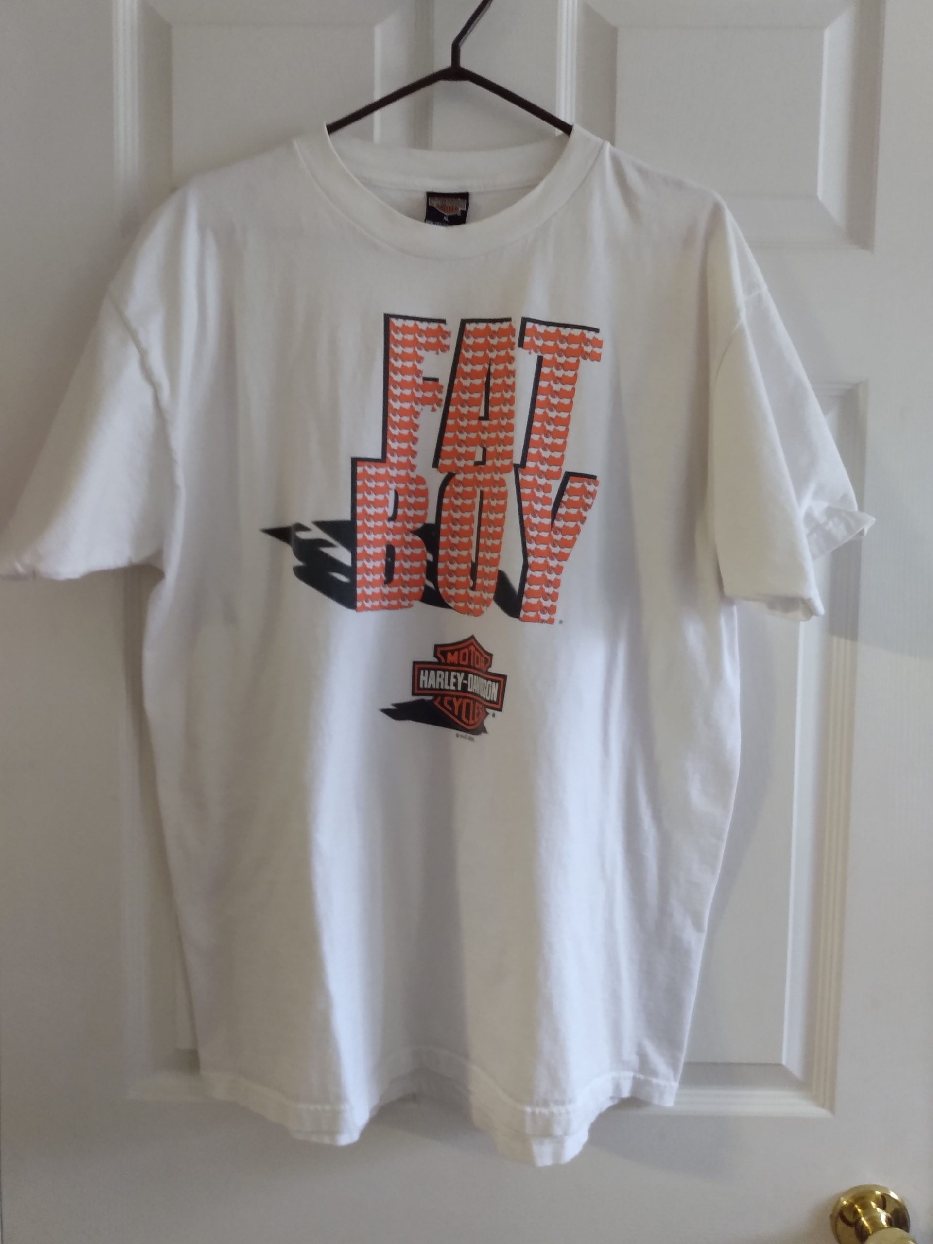 • Label: Harley-Davidson • Made in U.S.A. • 100% Cotton • Size – X-Large • Color- White • Graphics front, back, and arms • FAT BOY 2000-HD • Mike’s Famous HD New Castle • Good Condition